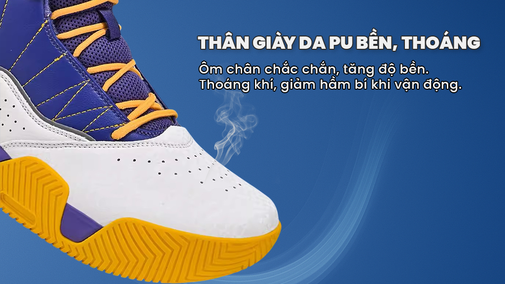 Thân giày làm từ da PU dày, chắc chắn, giữ form tốt và chống trầy xước, rất phù hợp khi chơi ngoài trời. Các lỗ thoáng khí được bố trí ở mũi và thân giày giúp lưu thông không khí, giảm cảm giác hầm bí. Những điểm chịu lực quan trọng như phần buộc dây hay mép cổ đều được may gia cố để tăng độ bền trong quá trình sử dụng.