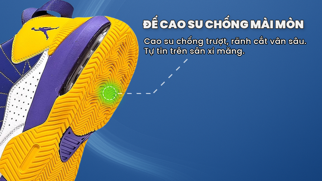 Phần đế sử dụng cao su gum, loại cao su có độ bền và độ ma sát cao hơn cao su thường. Đây là lợi thế lớn khi chơi trên sân xi măng hay bê tông, vì giày chịu mài mòn tốt và giữ được độ bám lâu dài. Vân đế dạng xương cá được thiết kế sâu và rộng, cho lực bám chắc chắn khi dừng đột ngột hoặc đổi hướng. Ngoài ra, rãnh cắt thưa còn giúp thoát bụi và duy trì độ bám ổn định.