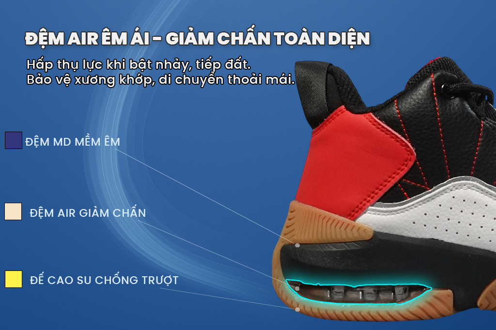 Đây là một trong những đôi giày hiếm hoi trong tầm giá rẻ nhưng lại sở hữu bộ đệm Air kết hợp MD Foam, vốn chỉ thường thấy ở phân khúc cao hơn. Đi kèm là đế cao su gum bền bỉ, TPU chống xoắn và phần cổ đệm dày bảo vệ. Với người mới tập bóng rổ hoặc những ai thường xuyên chơi ngoài trời, đây là lựa chọn cân bằng giữa chi phí và hiệu năng, giúp bạn yên tâm tập luyện lâu dài.