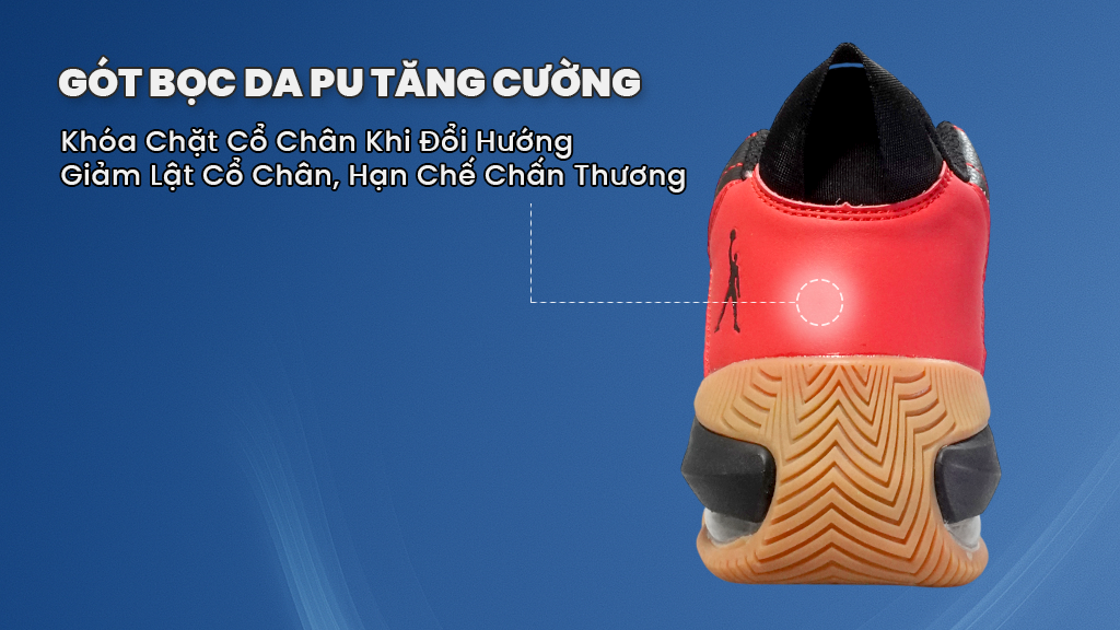 Với người mới chơi, việc lật cổ chân là nỗi lo thường trực. Đôi giày này được trang bị TPU chống xoắn ở giữa đế, giúp bàn chân ổn định hơn khi xoay chuyển hoặc đổi hướng nhanh. Phần cổ giày và lưỡi gà có lớp đệm dày ôm chắc mắt cá, giữ chân vững khi tiếp đất. Ở gót còn có lớp bọc PU tăng cứng, hạn chế trượt gót và hỗ trợ truyền lực hiệu quả.