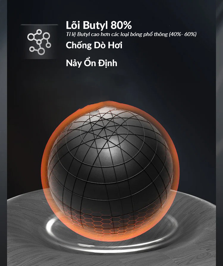 Tỷ lệ butyl cao hơn bóng phổ thông (chỉ 40–60%), giúp giữ hơi lâu hơn, hạn chế xì hơi khi thi đấu và duy trì độ nảy đồng đều trong nhiều ngày chơi liên tục.